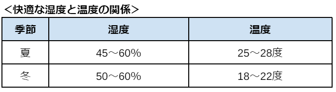 快適に過ごせる部屋の湿度は40~60%といわれ、季節によって快適な湿度は変わります。夏は除湿機やエアコンの除湿機能、冬は加湿器を使用して、最適な湿度をキープしましょう。湿度が10%上がると体感温度は約1度下がるといわれており、気持ちよく過ごすには湿度と温度のバランスが大切です。自分の体感に合わせて、最適な湿度・温度を見つけましょう。