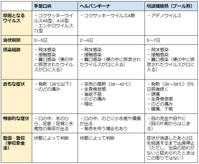 <手足口病・ヘルパンギーナ・咽頭結膜熱(プール熱)の特徴>