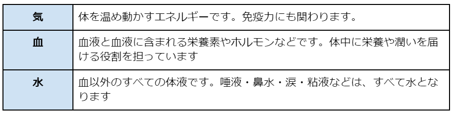 体を作る3要素で、気・血・水は、十分に存在し、十分に巡っている状態が大事です。気・血・水が足りなければ補う漢方薬を使い、巡りが滞っていれば巡らせる漢方薬を使うのが基本です。
