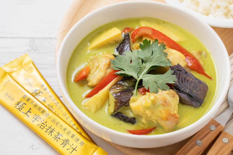 鶏肉はこんがりと焼き色をつけると、味に深みをプラスしてくれます。極上 宇治抹茶青汁は火を止めてから混ぜ込んでください。香りが残りやすくなるので、カレーによい風味を加えてくれます。