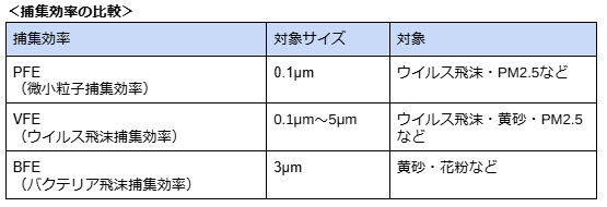 黄砂対策用のマスクを選ぶ際は、捕集効率の基準を満たした製品を選びましょう。捕集効率には、PFE・VFE・BFEなどがあり、粒子サイズごとの防御性能を評価しています。たとえば、「BFE99%」の表示がある製品は、3µmの細菌を含む粒子を99% カットできると認められた製品です。