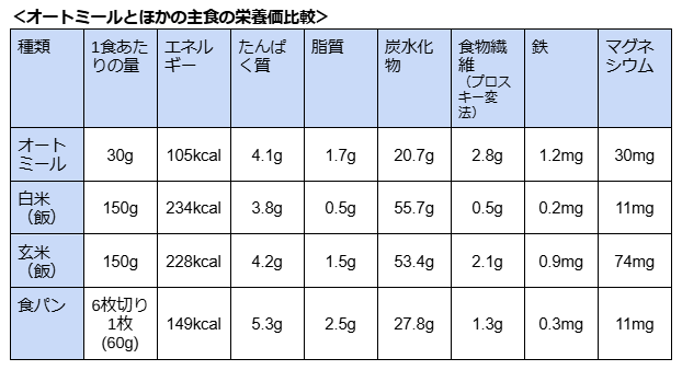 オートミールとほかの主食と比べて、「1食あたり」のカロリーと炭水化物が控えめでありながら、食物繊維や鉄が豊富なのが特徴です。