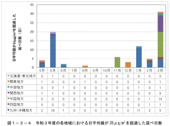 PM2.5は冬から春先にかけて濃度が上昇し、夏から秋にかけては比較的安定する傾向に。環境省の「令和3年度の各地域における日平均値が35μg/m3を超過した延べ日数」では、1~5月にかけて増えているのがわかります。