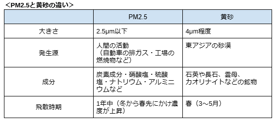 PM2.5と黄砂の大きな違いは、PM2.5が汚染物質として問題視されている点です。大きさ・発生源・成分・飛散時期も異なります。どちらも体内に入ると、健康被害が起こるとされています。違いは表のとおりです。
