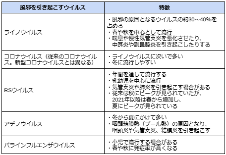 風邪を引き起こす代表的なウイルスは以下のとおりです。