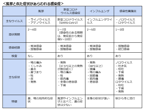 風邪と似た症状があらわれる代表的な感染症は、新型コロナウイルス感染症やインフルエンザ、感染性胃腸炎などです。医師の診察や感染者との接触状況をもとに診断されるケースと、検査で診断されるケースがあります。違いを下記の表で確認しましょう。