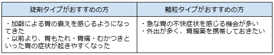 【第2類医薬品】 | 錠剤 | ★加齢による胃の衰えを感じるようになってきたときに。 ★以前より「胃もたれ」、「胃痛」、「むかつき」などの胃の不快症状が起きやすくなってきたときに。 ★自宅での常備におすすめの錠剤タイプ。 |
