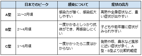 インフルエンザには、A型・B型・C型の3種類あります。それぞれ流行時期や感染力、症状に違いがみられるため、基礎知識として知っておきましょう。