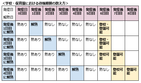 また、保育園の場合、発症後2日目以内の解熱であれば、待機期間は6日です。3日目以降、1日ずつ延びていきます。