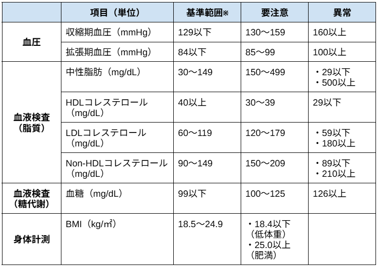健康診断の検査結果でとくに注目したいのは、血圧や中性脂肪、コレステロール、血糖の数値です。「要注意」あるいは「異常」と指摘されたときは、生活習慣を見直す必要があります。基準範囲と要注意、異常の基準は以下のとおりです。