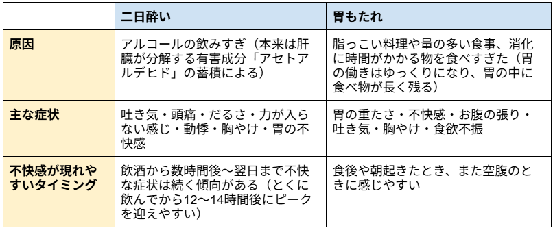 二日酔いなのか、胃もたれなのか、症状の違いを知るだけでも、自分なりの対処もしやすくなるでしょう。