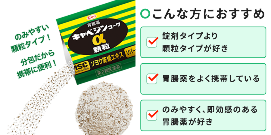 ついつい食べすぎてしまった日や、飲みすぎたあとに「なんだか胃が重い…」と感じるときはありませんか?胃の調子が気になるときは「キャベジンコーワα顆粒」。