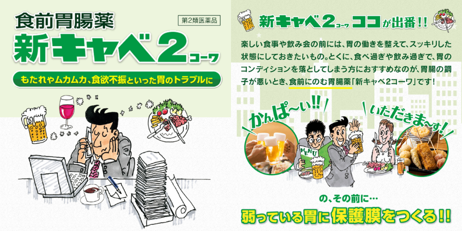 「新キャベ2コーワ」は、食事の前に「新キャベ2コーワ」をのむと、スッキリとして、食欲が出て食べられるようになります。個包装の顆粒タイプで携帯しやすく、水なしでも服用できるので、忙しい日常の中でも使いやすいのです。