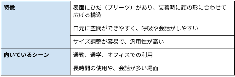 表面にひだ(プリーツ)があり、装着時に顔の形に合わせて広げて使う、一般的な形状です。口元に適度な空間が生まれやすく、比較的、呼吸や会話がしやすい利点があります。サイズの調整もしやすく、様々な顔の形にフィットするため、日常の幅広い場面で使いやすいマスクです。