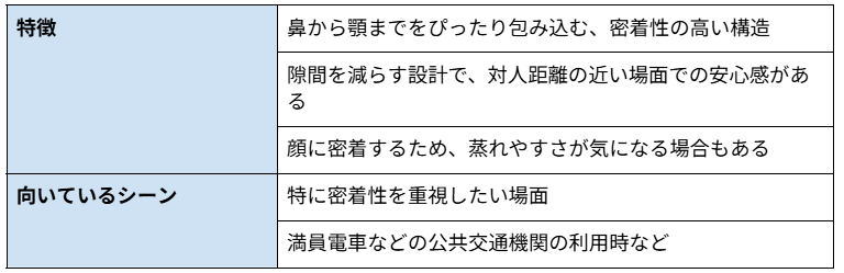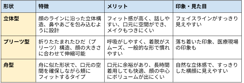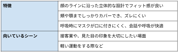 マスクと一口に言っても、その形状や構造は様々です。見た目だけでなく、構造によっても付け心地や使い勝手は大きく変わります。呼吸のしやすさ、顔へのフィット感、会話のしやすさなど、選ぶポイントは人それぞれです。 ここでは代表的なマスクの構造タイプを取り上げ、その特徴やおすすめの使用シーンを分かりやすくまとめました。