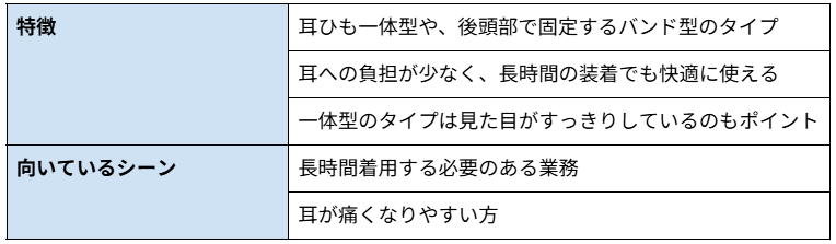 耳かけ一体型やバンド型のマスクは、耳ひもが本体と一体化していたり、後頭部で固定する構造が特徴です。耳への圧力が分散されるため、長時間の着用でも痛くなりにくく、快適さが持続しやすいメリットをもちます。 また、顔周りのラインがすっきり見える点も好まれており、とくに、接客業や医療現場といった長時間マスクを着用する人、耳が痛くなりやすい人に適しているでしょう。