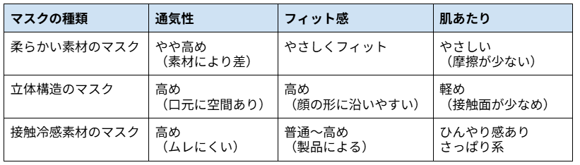 マスクを選ぶ上で重視される「通気性」「フィット感」「肌あたり」は、快適な着用感に直結する重要なポイントです。各項目について評価の基準を明確にしながら、タイプ別に比較しています。 通気性は息のしやすさや熱のこもりにくさ、フィット感は顔にしっかりと沿うかどうか、肌あたりはチクチク感や刺激の少なさを目安にしています。マスク選びに迷った際の参考にしてください。