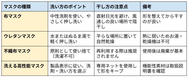 マスクを清潔に保つには、種類に応じた正しい洗い方と干し方が大切です。布やウレタン製のマスクは洗って繰り返し使えますが、洗い方を誤ると型崩れや劣化につながる場合もあります。また、不織布マスクは基本的に使い捨てが前提です。近年は洗える高性能マスクも登場していますが、素材ごとの扱いには注意が必要でしょう。そこで、マスクの種類別に洗い方と、干し方のポイントをまとめて紹介します。