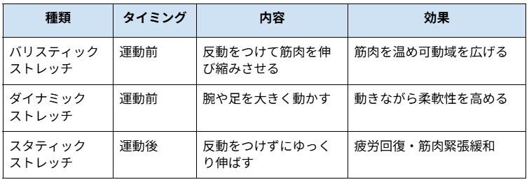 ウォーミングアップ・クールダウン共に欠かせないのが各種ストレッチ。目的やタイミングに応じて使い分けましょう。