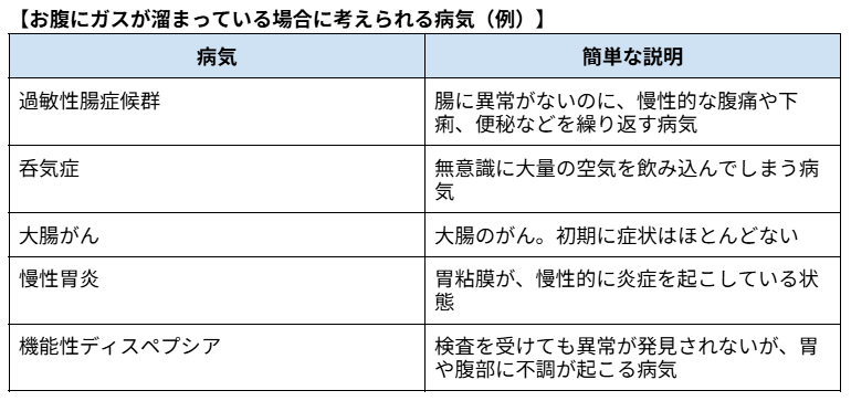 お腹の張りの原因になる代表的な病気には、ストレスが関係するとされる過敏性腸症候群や、空気を過剰に飲み込んでしまう呑気症などがあります。まれに大腸がんが隠れているケースもあるため、症状が続くときには専門医に相談するのが大切です。