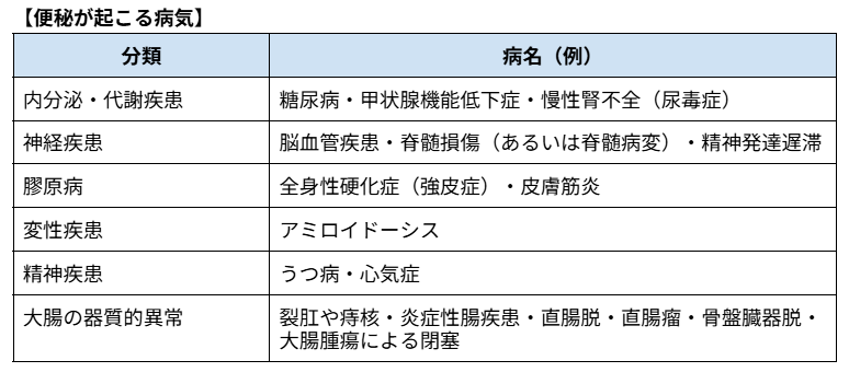 便秘を和らげたいなら、原因を知るのが改善への近道です。便秘は、主に生活習慣が関わる常習性便秘と、糖尿病や大腸腫瘍といった病気が原因となる二次性(器質性)便秘に分けられます。
