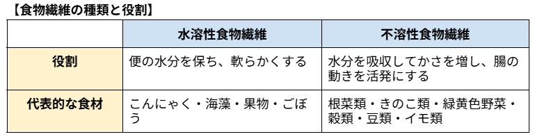 食物繊維は、便の量を増やして排便を促し、善玉菌のエサとなって腸内環境を整える重要な栄養素です。成人1日あたりの摂取目標量は男性20~22g、女性17~18g以上とされていますが、多くの人が不足しがちです。また、食物繊維には水溶性食物繊維と不溶性食物繊維の2種類があります。片方だけを摂取しないよう、食材を意識的に変えてみてください。