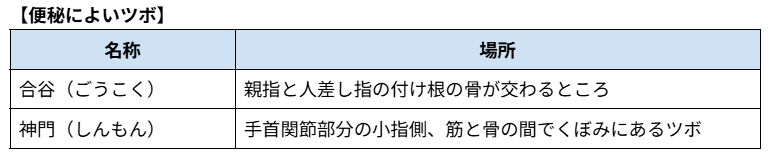 食事とあわせて生活習慣全体を見直すと、便秘になりにくい体づくりを目指せます。「の」の字マッサージ・お尻の筋肉を動かす運動・便秘によいツボといった簡単な方法を知っていると、すき間時間も便通を良好に保つ工夫に繋がるでしょう。