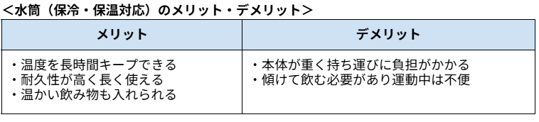 長時間適温をキープしたい方は、保冷・保温対応の水筒が適しています。炎天下のスポーツや寒い季節のレジャーでも快適に水分補給できる点が魅力です。