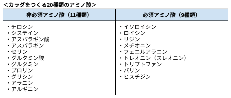 自然界には約500種類のアミノ酸が知られていますが、タンパク質の構成成分となるアミノ酸はたったの20種類だけです。20種類のうち11種類は体内で合成できますが、残りの9種類は体内で合成できないため、食事からの摂取が欠かせません。体内で合成できるアミノ酸を「非必須アミノ酸」、合成できないアミノ酸を「必須アミノ酸」と呼びます。