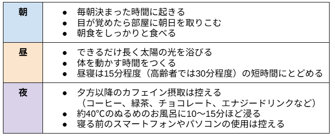 朝は決まった時間に起き、日中は光を浴びながら体を動かしましょう。体内時計のリズムが整い、夜に自然と眠りやすくなります。カフェインには覚醒作用があり、眠りを浅くするため夕方以降は控えてください。