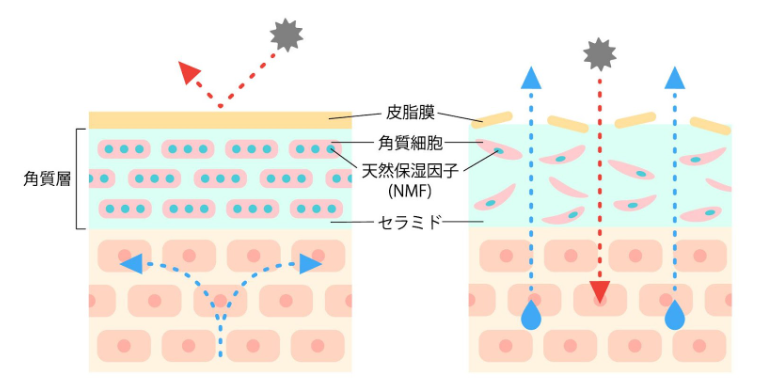 健康な肌はバリア機能がしっかり働いており、うるおいのある美しい状態を保てます。しかし、洗いすぎや強い摩擦・紫外線・乾燥・アレルギー物質などの影響でバリア機能が低下すると、肌水分が失われやすくなり、外部刺激を受けやすい状態になってしまうのです。