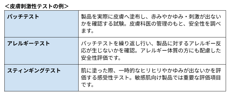 敏感肌さんやゆらぎ肌さんは「皮膚刺激性テスト済み」の表示も確認するとよいでしょう。すべての方に刺激やアレルギーが起こらないわけではありませんが、肌への影響を考える目安になります。