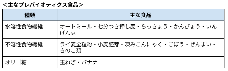 プレバイオティクスは、腸内にもともと存在する善玉菌のエサになる成分です。水溶性食物繊維や不溶性食物繊維、オリゴ糖が挙げられます。とくに、善玉菌を増やすためには水溶性食物繊維が有効です。穀類やいも類、野菜などからバランスよく摂取しましょう。