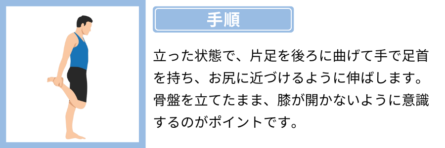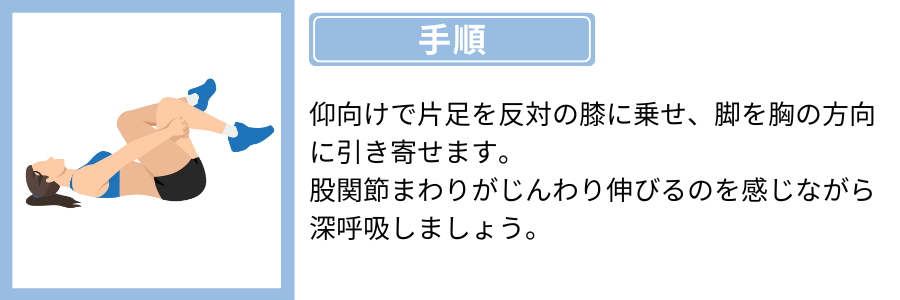 前述した太ももの前側のストレッチを、とくに念入りに行いましょう。余裕があるときは、横向きに寝た状態で足首をつかむと、さらに深く伸ばせます。
