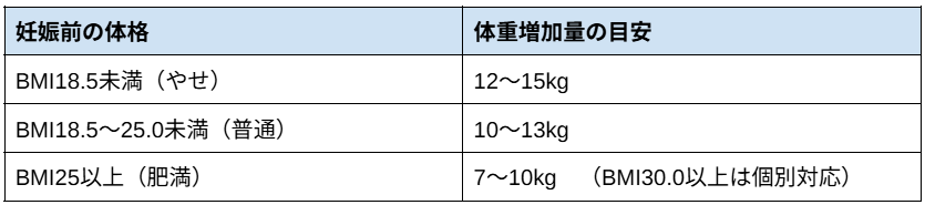 妊娠中の体重増加目安は以下のとおりです。ただし、個人差を考慮する必要があるため、妊婦健診で確認しましょう。
