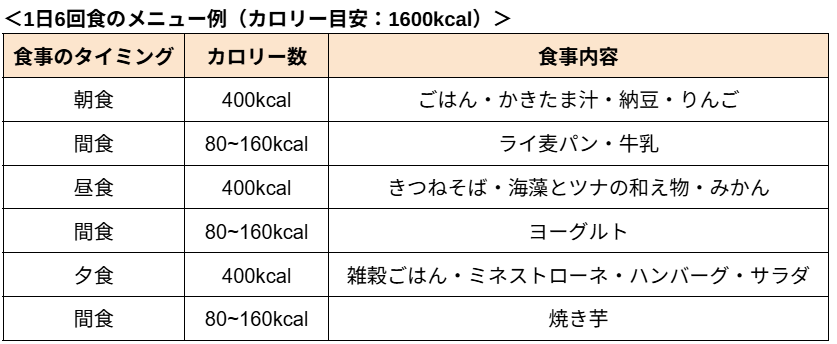 6回食を生活にとり入れる場合、カロリーの配分は、朝昼夕が各25%程度・間食が5~10%程度が目安です。