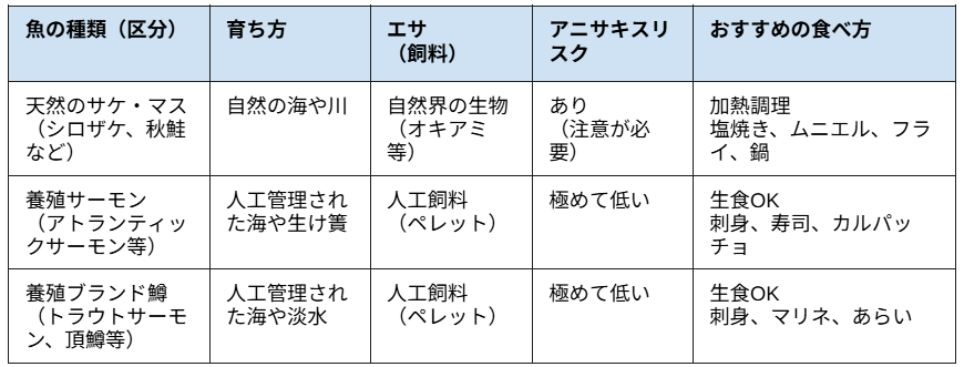 国内外で養殖されたサーモンやマスの中には、『生食用』として販売される商品が数多く存在します。アニサキスが入り込むリスクを極限まで排除した環境で育てられているからです。
