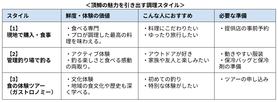 一度も冷凍されていない、生のままの弾けるような食感と香りを楽しむには、現地訪問が最適解です。水揚げされたばかりの魚を自ら手にするか、地元の飲食店や旅館で幻の味を堪能する。産地ならではの鮮烈な美味しさは、わざわざ足を運ぶ価値が十分にあります。
