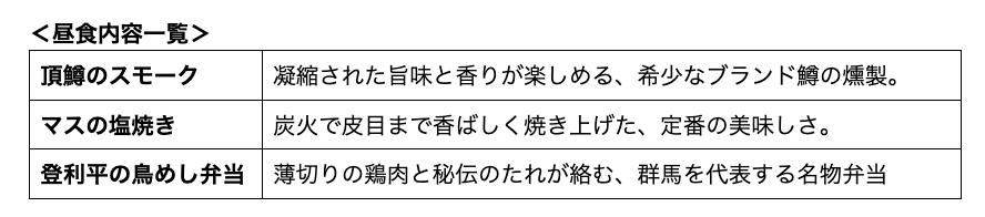 ランチには、幻の頂鱒をスモーク(燻製)で味わう贅沢や、群馬県民のソウルフード『登利平(とりへい)』の鳥めし弁当をご用意。まさに“大人のご褒美体験”を一日で完結できるプランなのです。