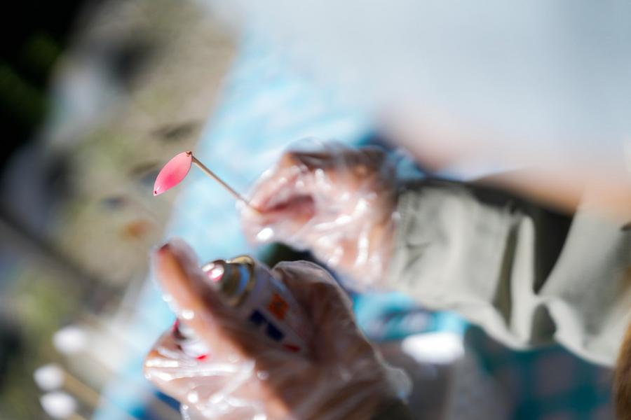 今回紹介するツアーの大きな魅力が、釣り体験の前に実施される『オリジナルルアー作り』です。 シルバーの金属ルアーにスプレーで色を重ね、世界に一つだけの相棒を作り上げます。スタッフが丁寧にコツを伝授するため、工作が初めてのお子さんでも失敗知らず。