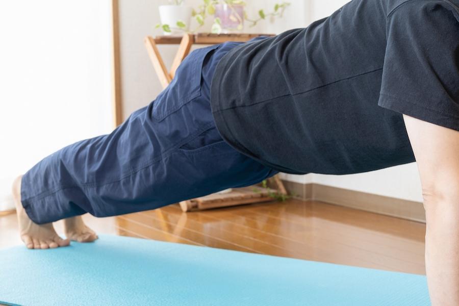 プランクは、両肘とつま先で体を支え、一直線の姿勢を維持するトレーニングです。腹直筋だけでなく、インナーマッスルである腹横筋も同時に鍛えられます。お腹が落ちたり腰が反ったりしないよう、注意して行ってみてください。