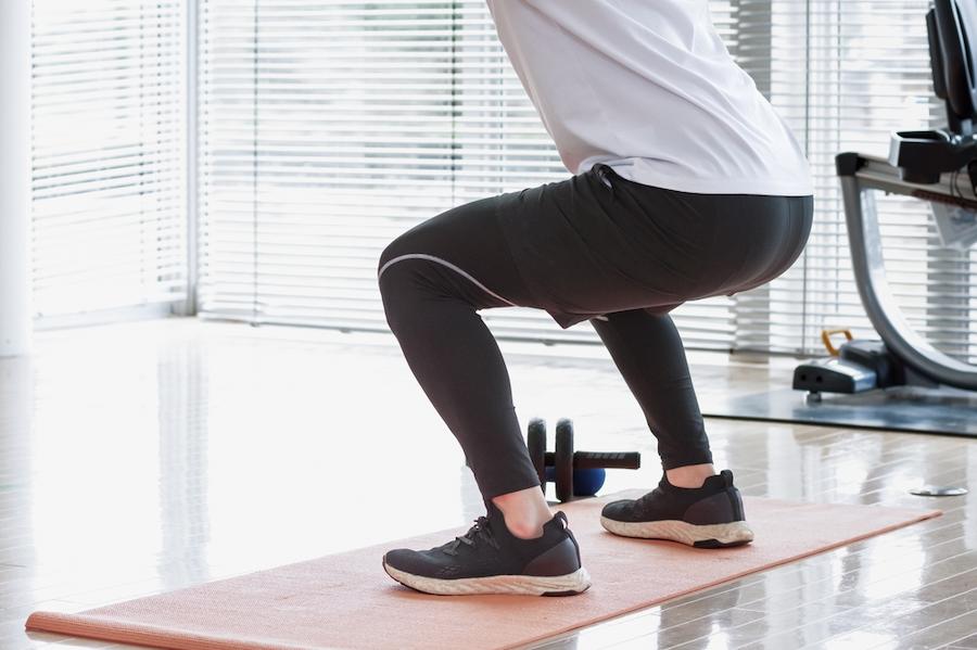 スクワットは、下半身の大きな筋肉を動かすため、消費エネルギーのアップにも役立ちます。お腹の筋肉とも連動しており、体脂肪を減らすために有用です。