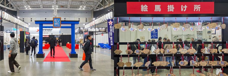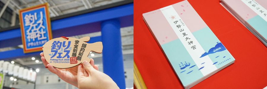 会場の一角に、ひときわ賑やかなエリアがありました。横浜総鎮守・伊勢山皇大神宮とコラボレーションした『釣りフェス神社』です。本格的な鳥居が構えられ、多くの来場者が今年一年の安全と釣果を祈願していました。