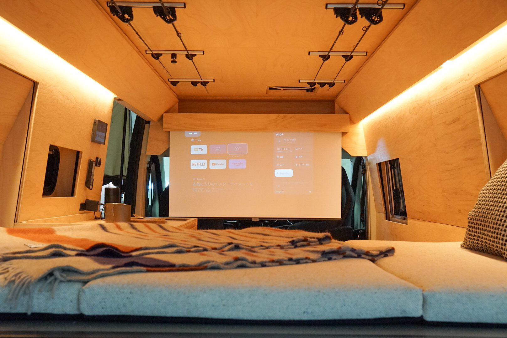車内を覗き込むと、そこには驚きの光景が。なんと、濡れたレインウェアを乾かすため「ドライルームや、本格的な調理が可能なキッチンテーブルが鎮座しています。さらに天井にはリールをセットした状態で6~7本の釣竿を天井に収納できるという、もはや家を超えた快適趣味空間だったのです。
