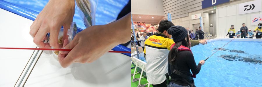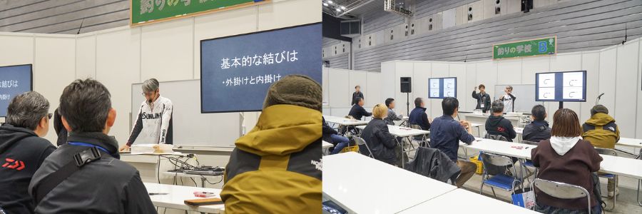 ちょうど私たちが来場した頃『学校B』では、初心者が最初にぶつかる壁、"糸の結び方(ノット)"の講習が行われていました。PEラインとリーダーの結束…言葉にするだけで難しそうに感じますが、プロの手ほどきを受ければ案外スムーズに習得できるようです。「これさえ覚えれば、一人でも釣りに行ける!」と、参加者の顔つきが変わっていく瞬間が印象的でした。