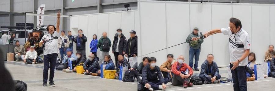 特筆すべきは、やはりキャスティングの実演です。狙ったポイントへ吸い込まれるようにルアーが飛んでいく軌道は、まさに神業。「ビシュッ!」という鋭い風切り音を間近で体感できるのは、現場に足を運んだ人だけの特権でした。