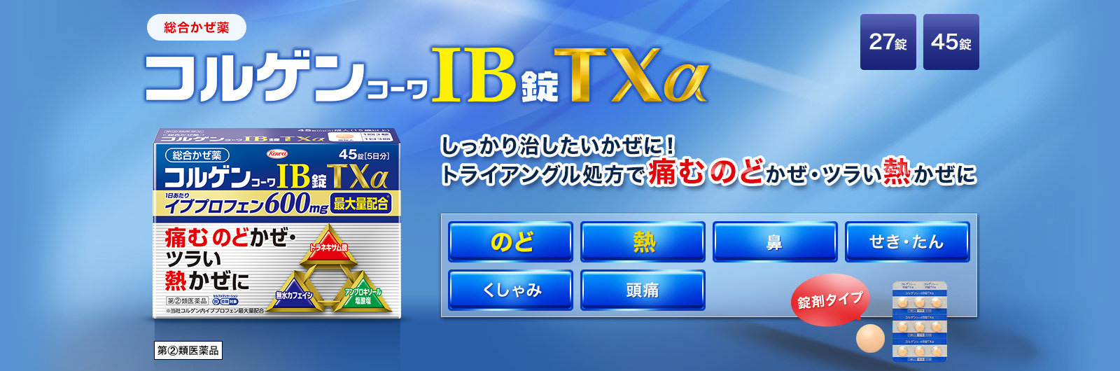 解熱鎮痛成分イブプロフェンを600mg(1日量)配合した総合かぜ薬です。のどの痛みや発熱を伴うかぜの症状に対応。