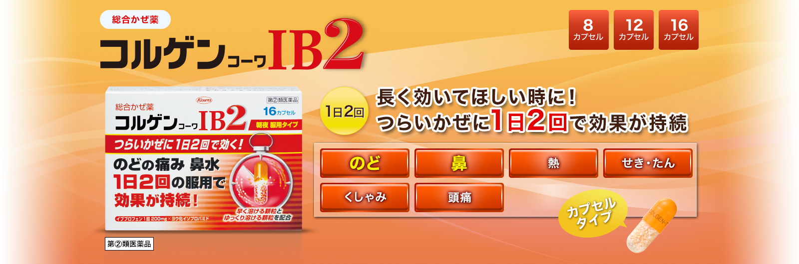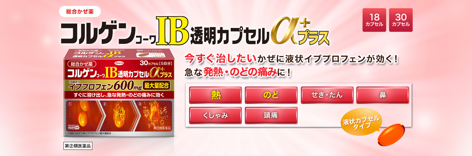 頭痛や発熱に対応するイブプロフェンを配合。カプセル内の液状成分が体内で素早く溶け出し、発熱やのどの痛みを緩和します。