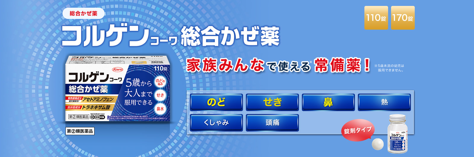 5歳から大人まで服用できる、ファミリータイプの総合かぜ薬として、常備するのはいかがでしょうか。
