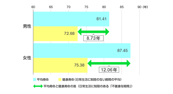 健康寿命とは、「健康上の問題で日常生活が制限されることなく生活できる期間」。